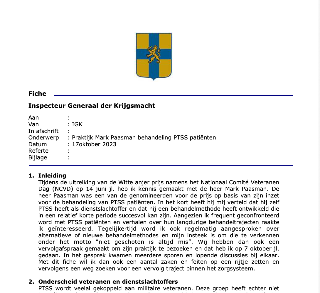 DE OFFICIËLE ERKENNING "De Inspecteur-Generaal der Krijgsmacht schrijft geen fiches voor de gezelligheid. In 2023 stelde de IGK officieel vast: reguliere trajecten duren te lang. De methode van Mark Paasman biedt een doorbraak in dagen."